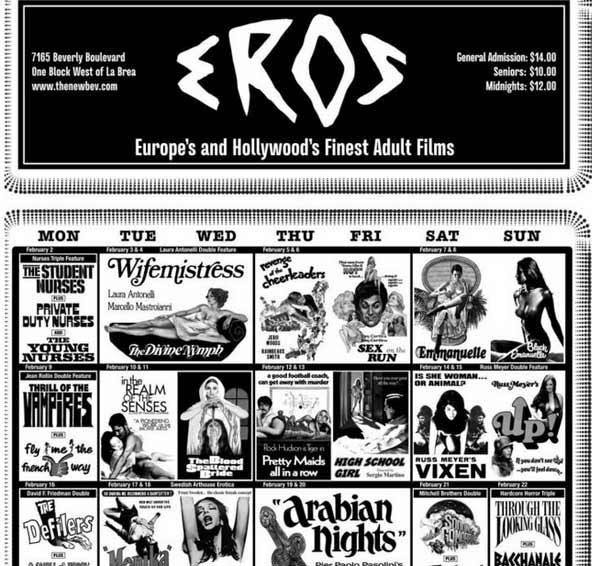 Dirty Movies of Yore; Quentin Tarantino's New Beverly Cinema Used to Be Called The Eros in the Seventies, Another Type of Grindhouse, If You Know What I Mean; Throughout the month, Quentin will be encouraging civic depravity by showing 23 nudie films. Hard-R. We must condemn him. I shall have to go to all 23 films to gather evidence. Another burden to bear